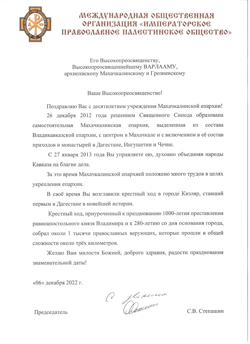 Сергей Степашин направил поздравительное письмо в адрес архиепископа Махачкалинского и Грозненского Варлаама по случаю 10-летия со дня учреждения Махачкалинской епархии