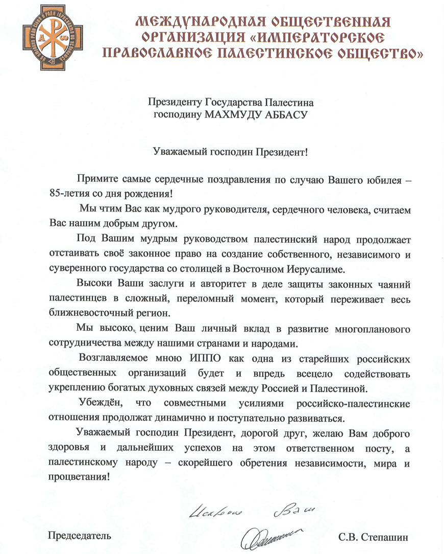 Председатель Императорского Православного Палестинского Общества Сергей Степашин направил поздравление господину Махмуду Аббасу по случаю юбилея.