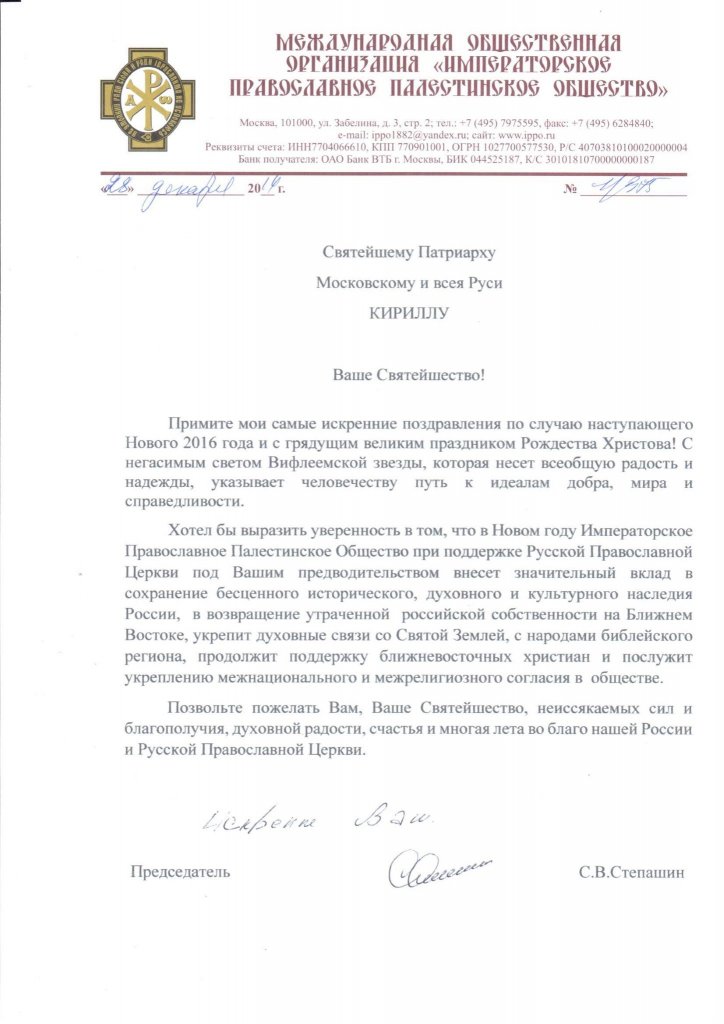 Председатель ИППО Сергей Степашин направил поздравление Святейшему Патриарху Московскому и всея Руси Кириллу, Председателю Комитета Почетных членов ИППО, по случаю наступающего Нового года и грядущего Рождества Христова.