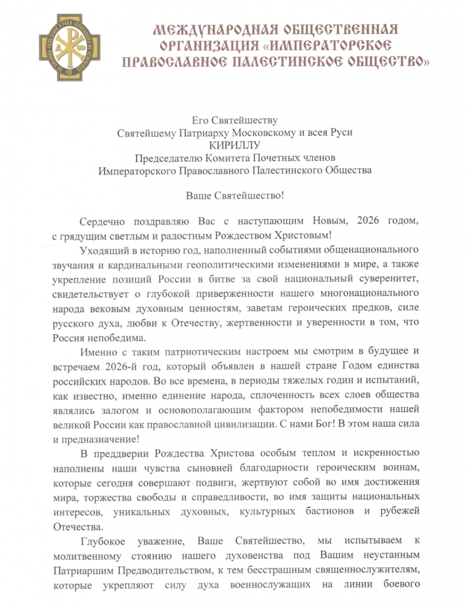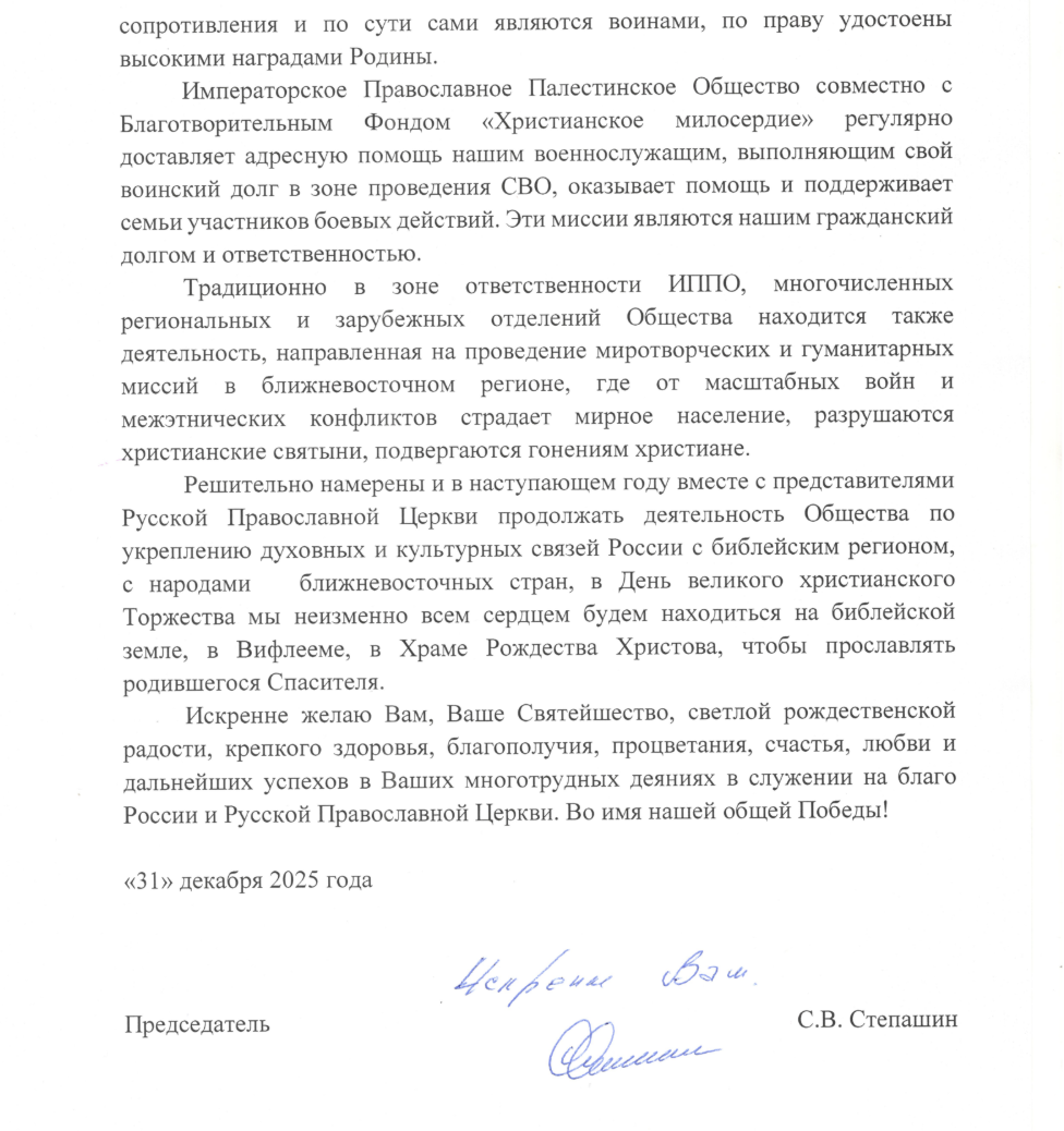 Председатель Императорского Православного Палестинского Общества Сергей Степашин направил поздравление в адрес Святейшего Патриарха Московского и всея Руси Кирилла, Председателя Комитета Почетных членов ИППО по случаю наступающего Нового года и грядущего Рождества Христова.