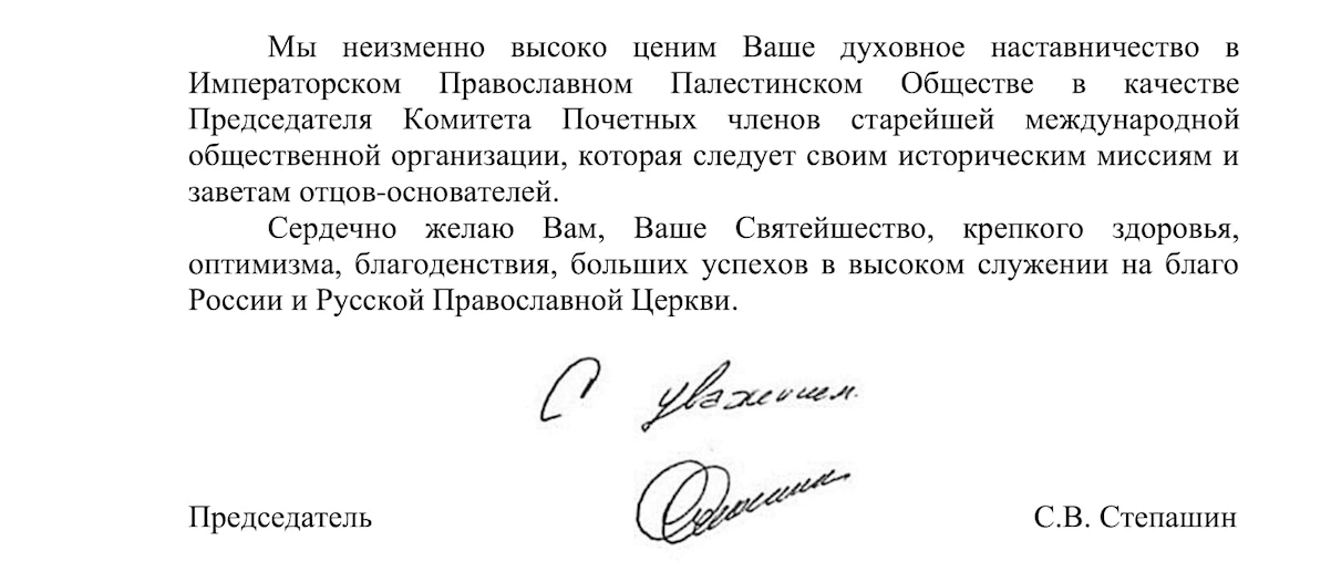 Председатель Императорского Православного Палестинского Общества Сергей Степашин направил поздравление в адрес Святейшего Патриарха Московского и всея Руси Кирилла, Председателя Комитета Почетных членов ИППО по случаю наступающего Нового года и грядущего Рождества Христова.