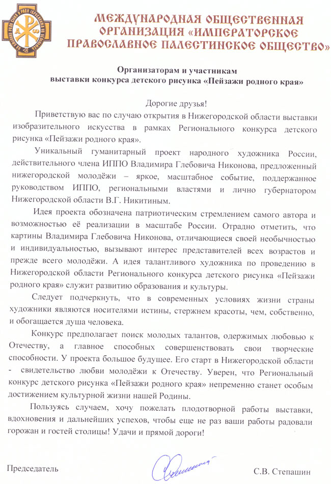 В Нижегородском государственном выставочном комплексе, где состоялась торжественная церемония подведения итогов и прошло награждение победителей и призёров регионального конкурса детского рисунка «Пейзажи родного края», руководитель Нижегородского отделения ИППО Олег Колобов представил участникам проекта приветствие Председателя Императорского Православного Палестинского Общества Сергея Степашина.