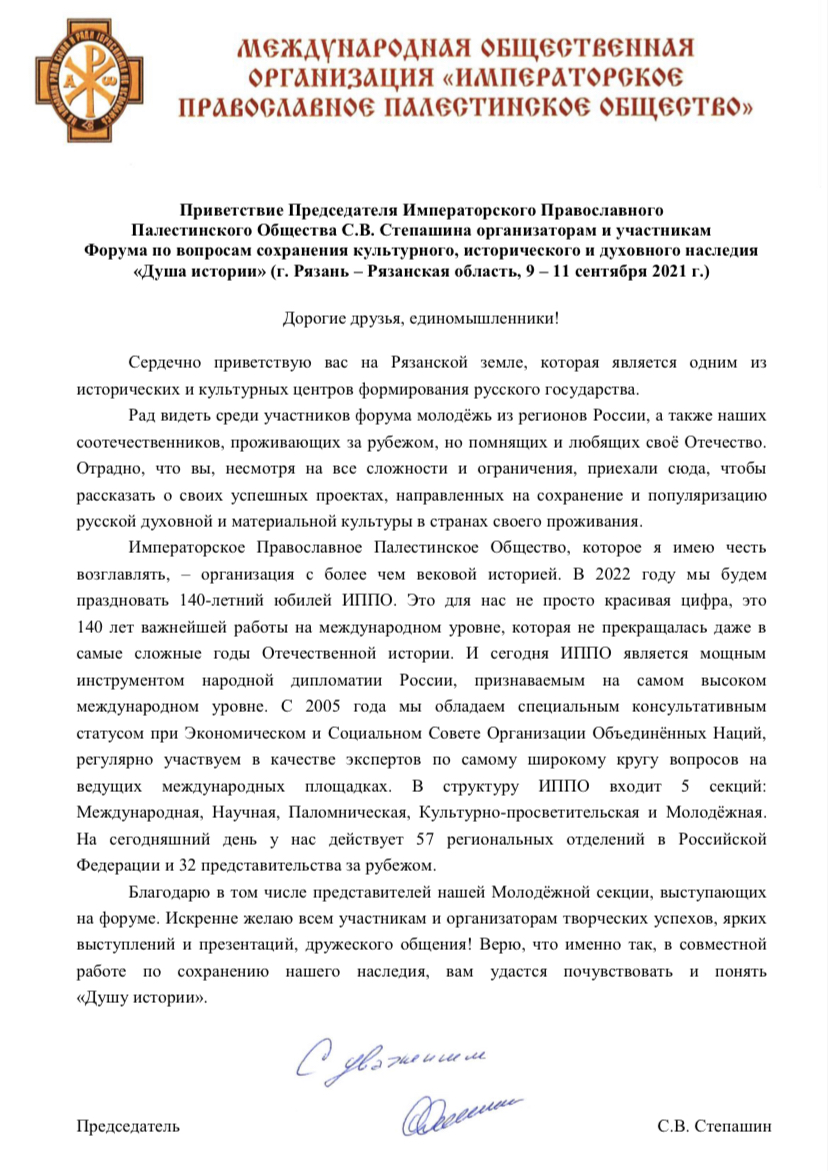 Приветствие в адрес организаторов и участников направил Председатель Императорского Православного Палестинского Общества Сергей Степашин.