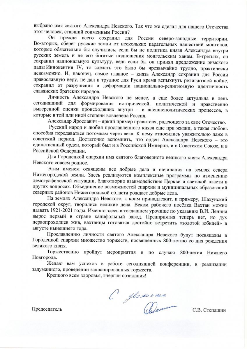 Сергей Степашин направил приветствие в адрес участников и организаторов конференции «Александр Невский. Солнце земли Русской. Церковно-общественные проекты»