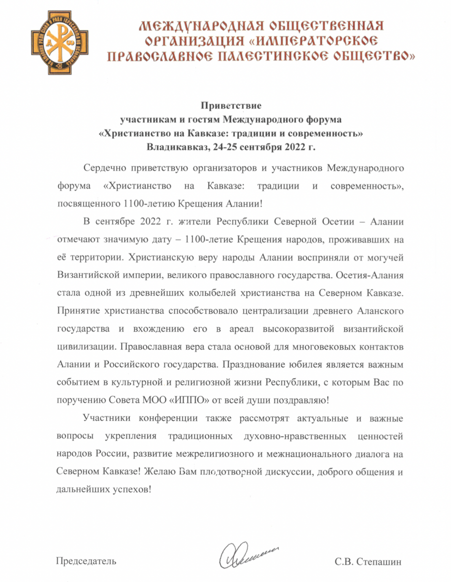 Сергей Степашин направил приветствие в адрес участников и гостей Международного форума «Христианство на Кавказе: традиции и современность»