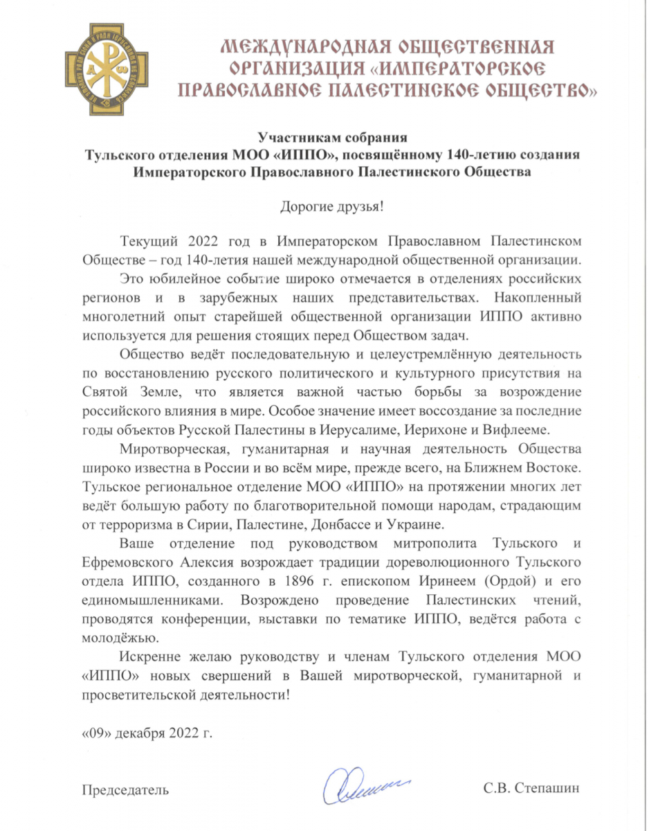 9 декабря 2022 года в Туле состоится итоговое собрание регионального отделения ИППО, посвящённое 140-летию учреждения Императорского Православного Палестинского Общества.