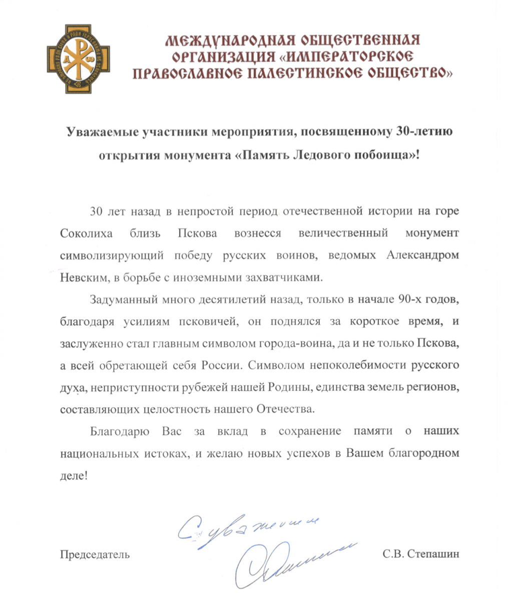 Сергей Степашин направил приветствие в адрес участников мероприятия, посвященного 30-летию открытия монумента «Память Ледового побоища!»