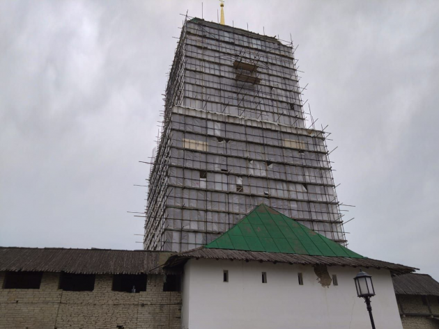 Особое внимание Михаил Ведерников и Сергей Степашин уделили колокольне Кремля. На сегодня на объекте заменена кровля, произведено золочение купола и шпиля с крестом, частично отреставрирован верхний ярус. На некоторых участках каменную кладку пришлось восстанавливать полностью. Впереди — приведение в порядок фасадов здания, внутренние отделочные работы.
