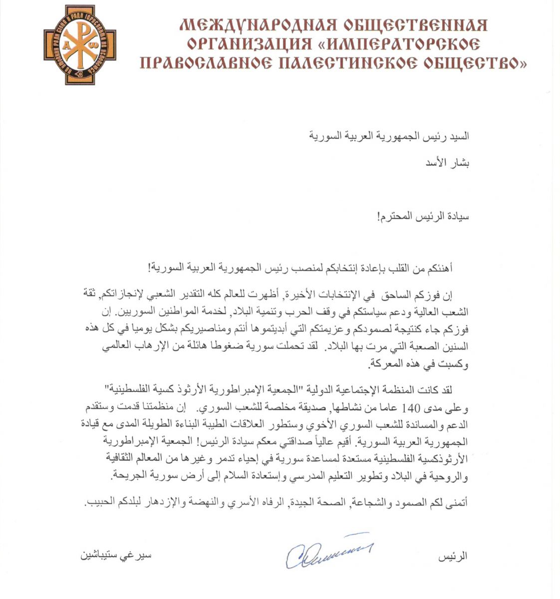 По случаю победы Башара Асада ( 95,1% голосов) на проходивших в Сирии 26 мая 2021 года президентских выборах Председатель Императорского Православного Палестинского Общества Сергей Степашин направил сирийскому лидеру поздравительную телеграмму.
