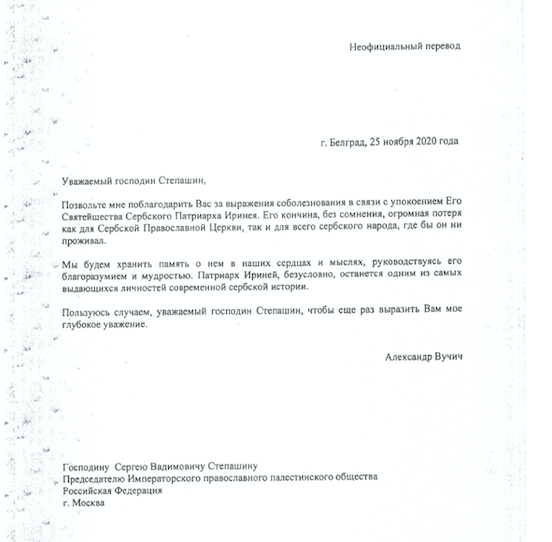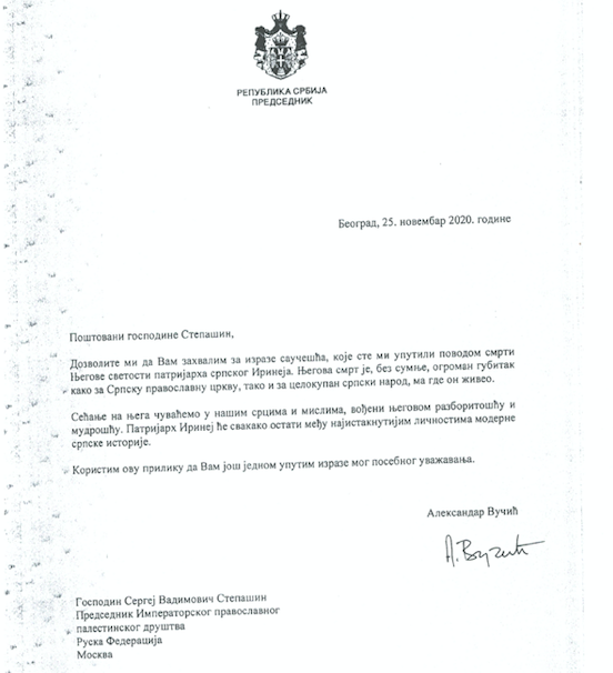 20 ноября 2020 года Председатель ИППО Сергей Степашин направил соболезнования в адрес Президента Республики Сербия Александра Вучича в связи со смертью Святейшего Патриарха Сербского Иринея.