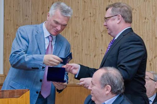 С. В. Степашин вручает М. И. Якушеву почетный памятный знак ИППО «Орден Великого князя Сергия Александровича» на Международной научной конференции «Императорское Православное Палестинское Общество в Святой Земле. К 130-летию со дня основания». 10 ноября 2011 г.