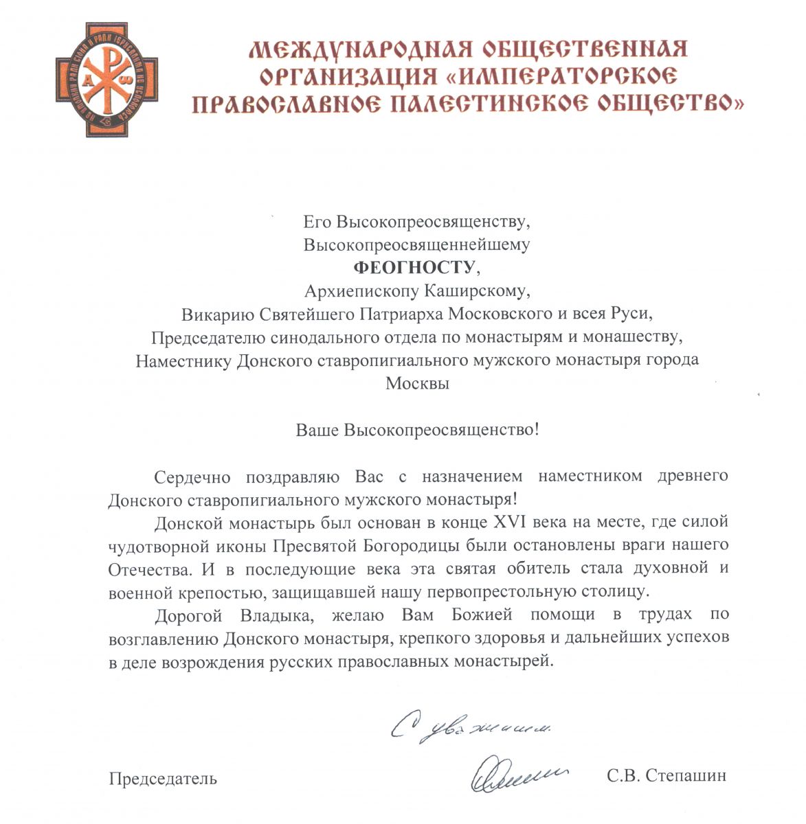 Председатель Императорского Православного Палестинского Общества Сергей Степашин направил поздравление, в котором говорится: