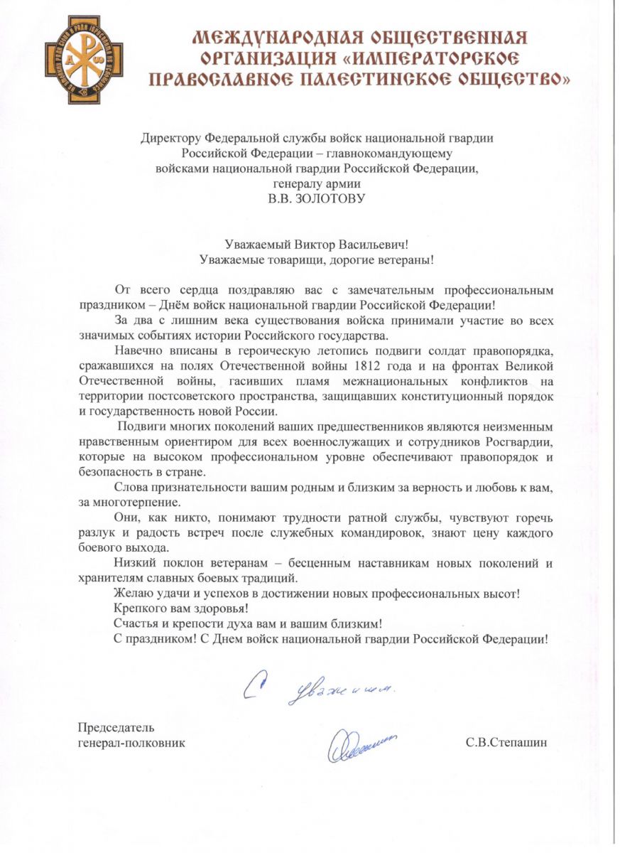 Председатель ИППО, генерал-полковник Сергей Степашин поздравил с профессиональным праздником директора Федеральной службы войск национальной гвардии Российской Федерации – Главнокомандующего войсками национальной гвардии РФ Виктора Золотова, военнослужащих и ветеранов.