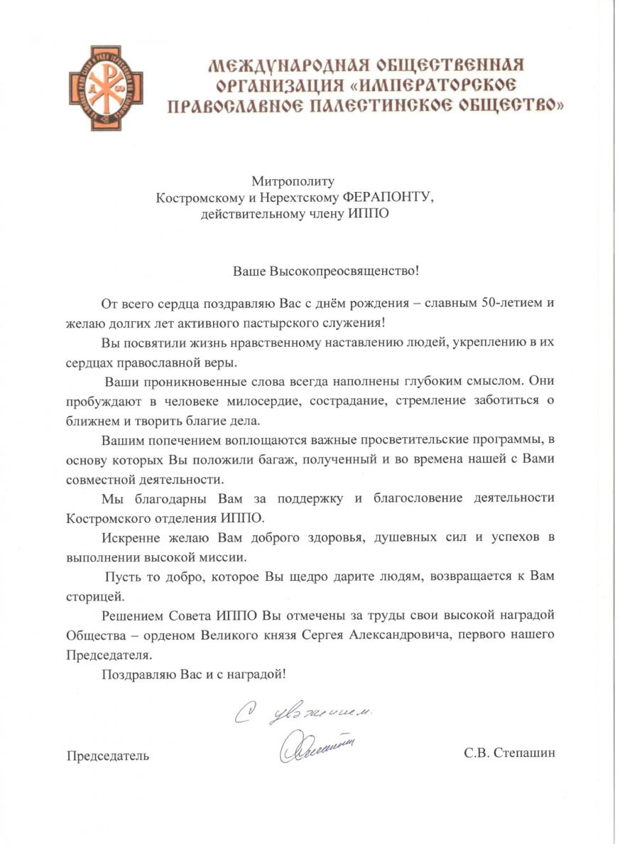 Сегодня исполняется 50 лет действительному члену ИППО митрополиту Костромскому и Нерехтскому Ферапонту. Сергей Степашин поздравил владыку с юбилеем.