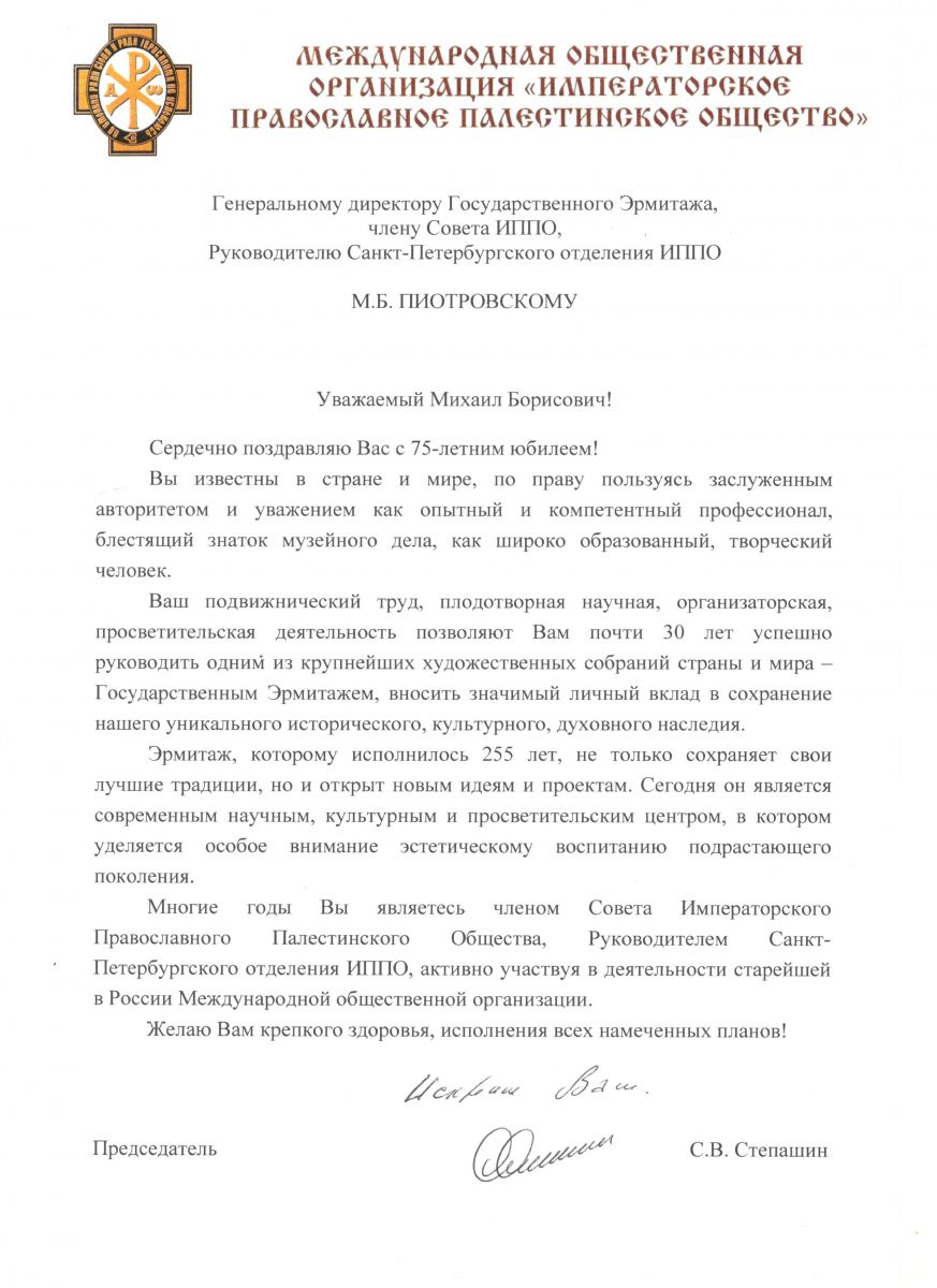 Председатель ИППО Сергей Степашин тепло поздравил Михаила Борисовича, поблагодарив за активную работу в Императорском Православном Палестинском Обществе, за содействие в реализации научных и культурно-просветительских проектов.