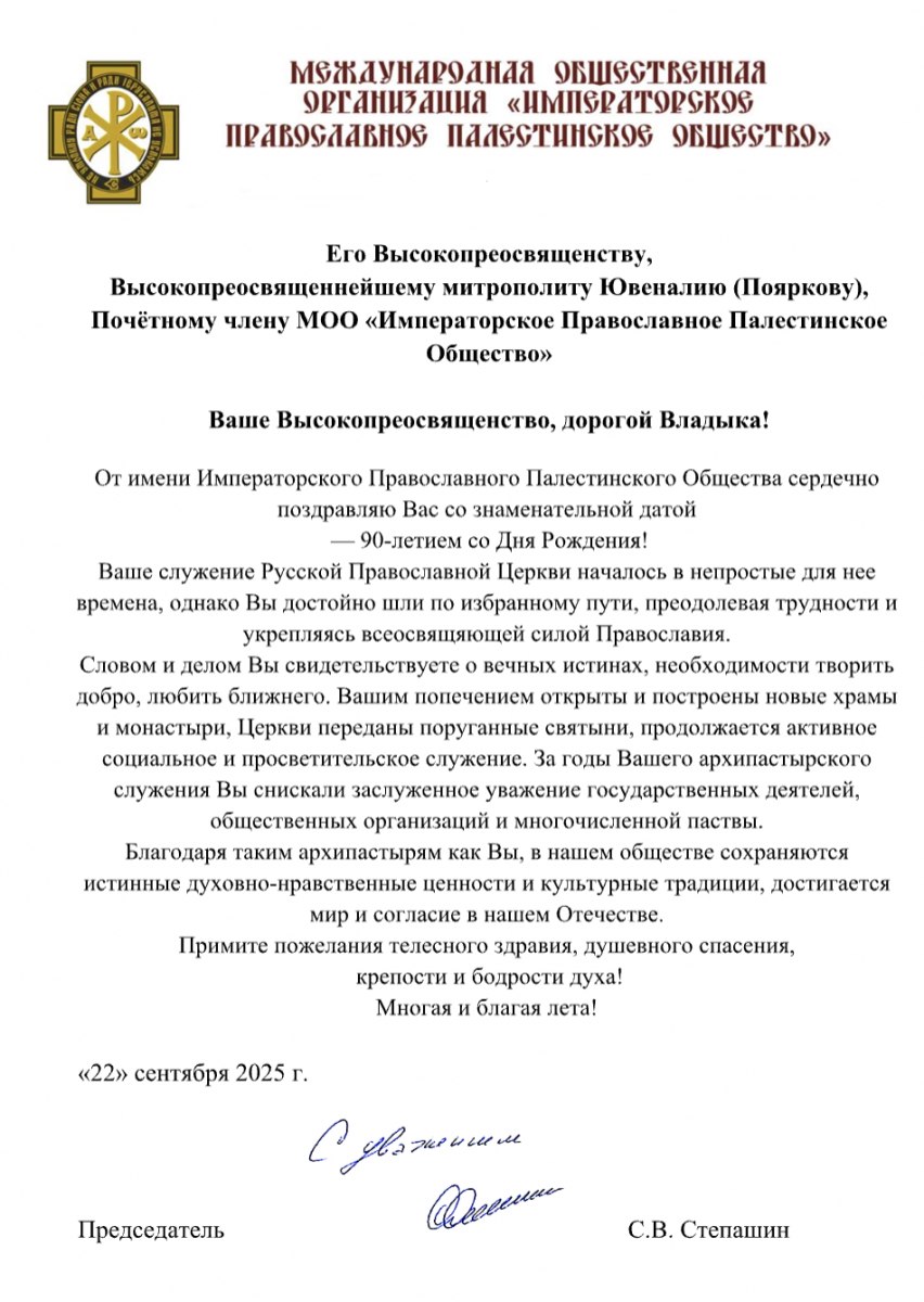 Председатель ИППО Сергей Степашин направил сердечное поздравление в адрес владыки: