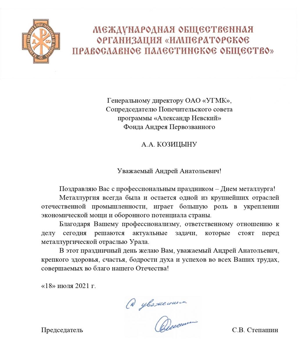 По этому случаю Председатель Императорского Православного Палестинского Общества Сергей Вадимович Степашин поздравил генерального директора Уральской горно-металлургической компании и ООО «УГМК-Холдинг», действительно