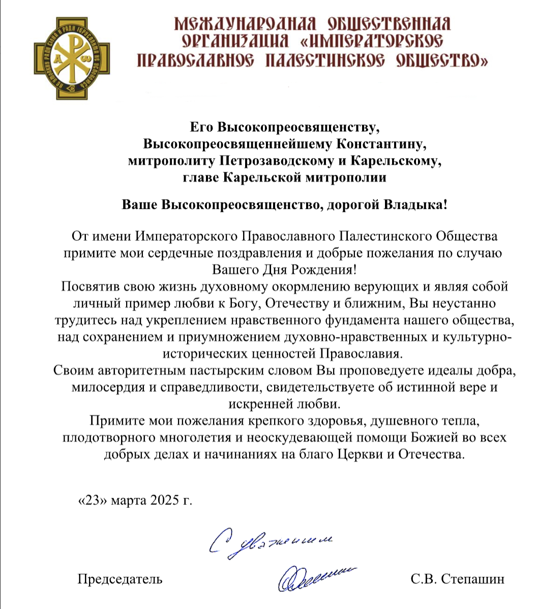 Поздравление в адрес митрополита Петрозаводского и Карельского Константина направил Председатель ИППО Сергей Степашин: