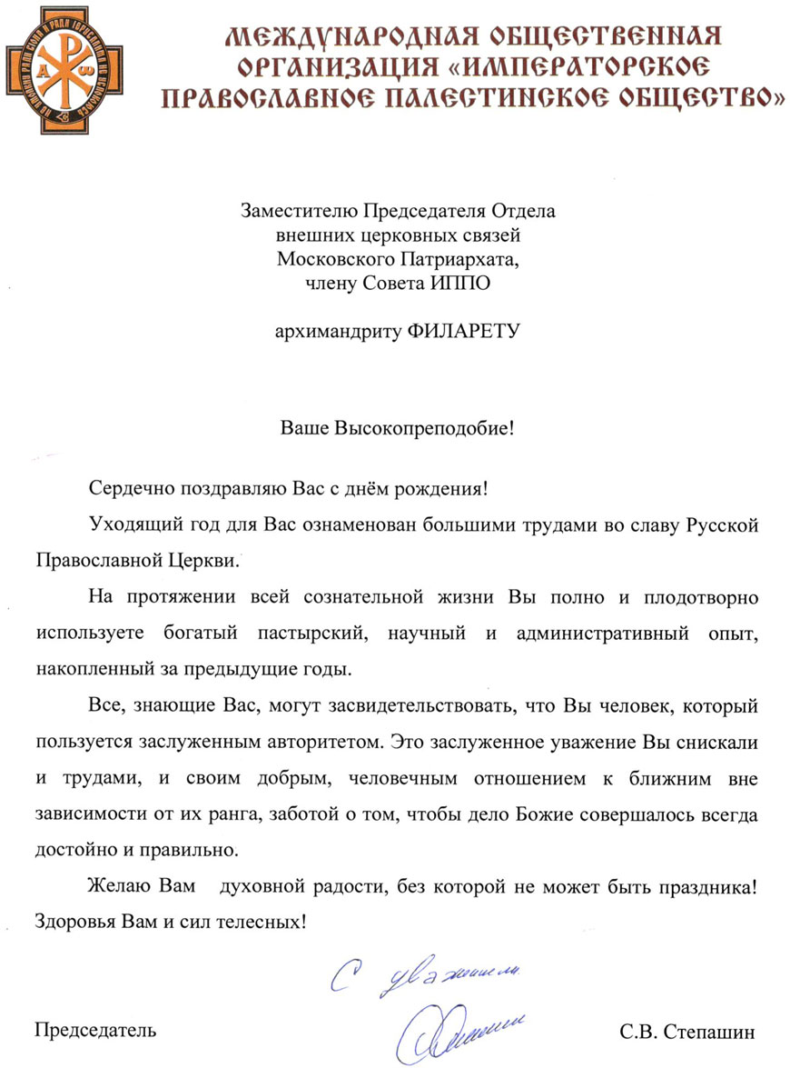 Сегодня день рождения у члена Совета ИППО заместителя председателя Отдела внешних церковных связей Московского Патриархата архимандрита Филарета (Булекова). Председатель Императорского Православного Палестинского Общества Сергей Степашин поздравил архимандрита Филарета с днём рождения.