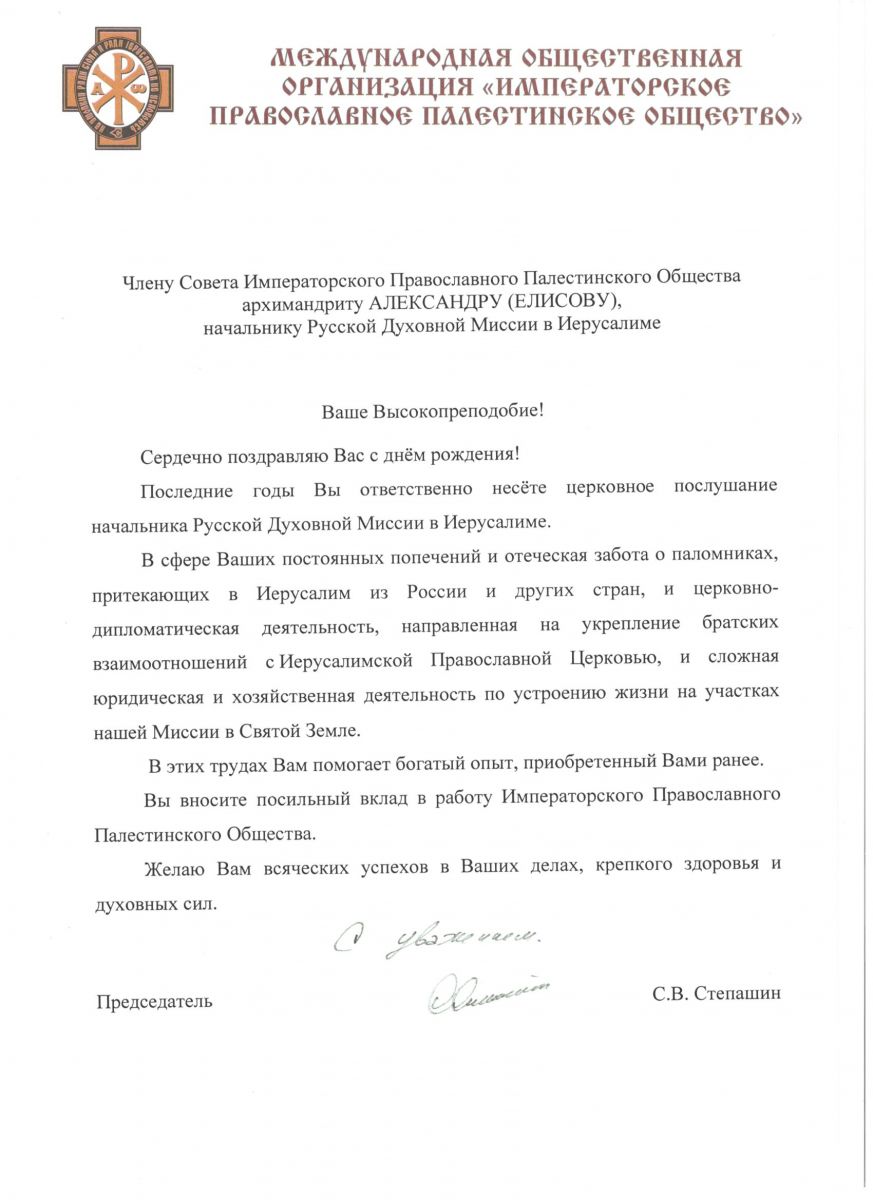 Сегодня день рождения у члена Совета ИППО, Начальника Русской Духовной Миссии в Иерусалиме архимандрита Александра (Елисова). Председатель Императорского Православного Палестинского Общества Сергей Степашин поздравил архимандрита Александра с днём рождения.