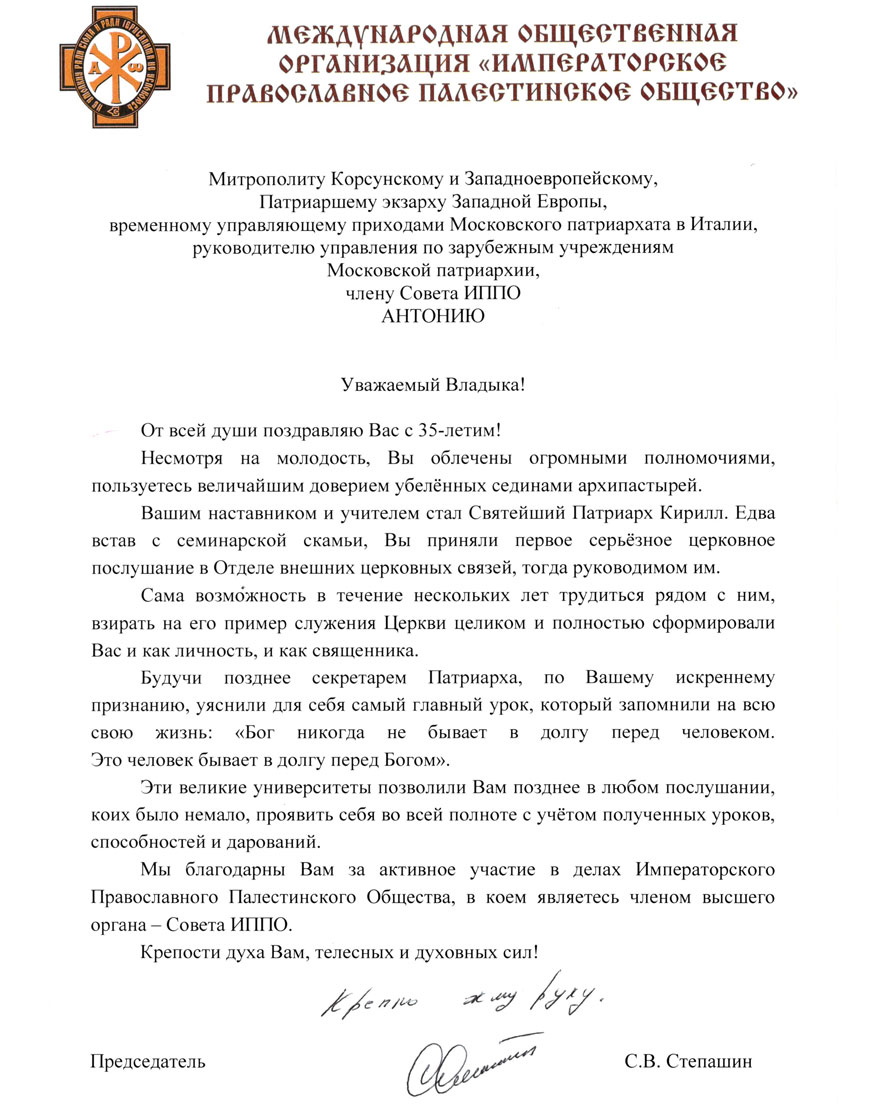 Председатель ИППО Сергей Степашин направил в адрес владыки поздравление, в котором говорится: