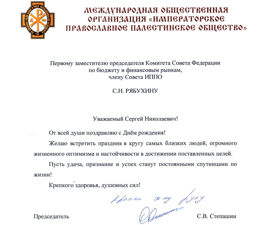 Председатель ИППО Сергей Степашин направил поздравление Сергею Николаевичу, в котором говорится: