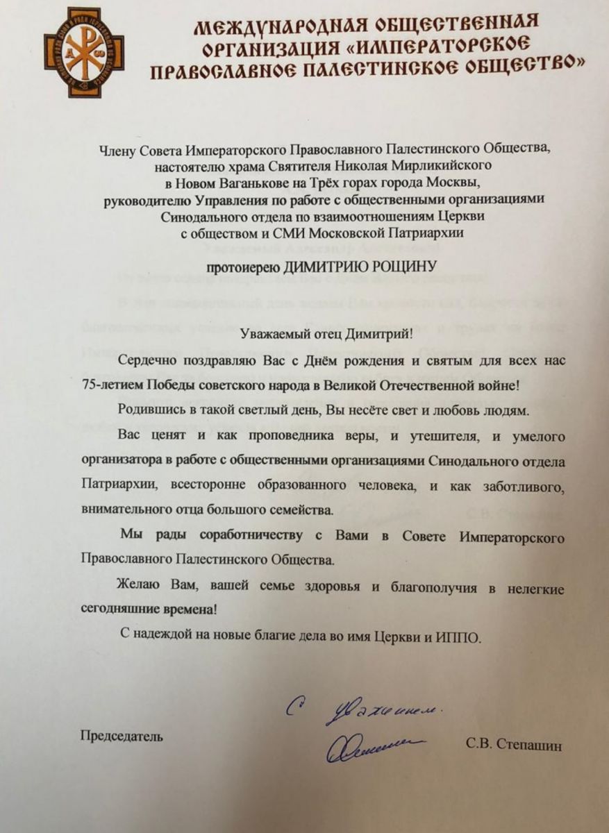 9 мая день рождения отмечает член Совета ИППО, настоятель храма Святителя Николая Мирликийского в Новом Ваганькове на Трёх горах города Москвы, руководитель Управления по работе с общественными организациями Синодального отдела по взаимоотношениям Церкви с обществом и СМИ Московской Патриархии протоиерей Димитрий Рощин.