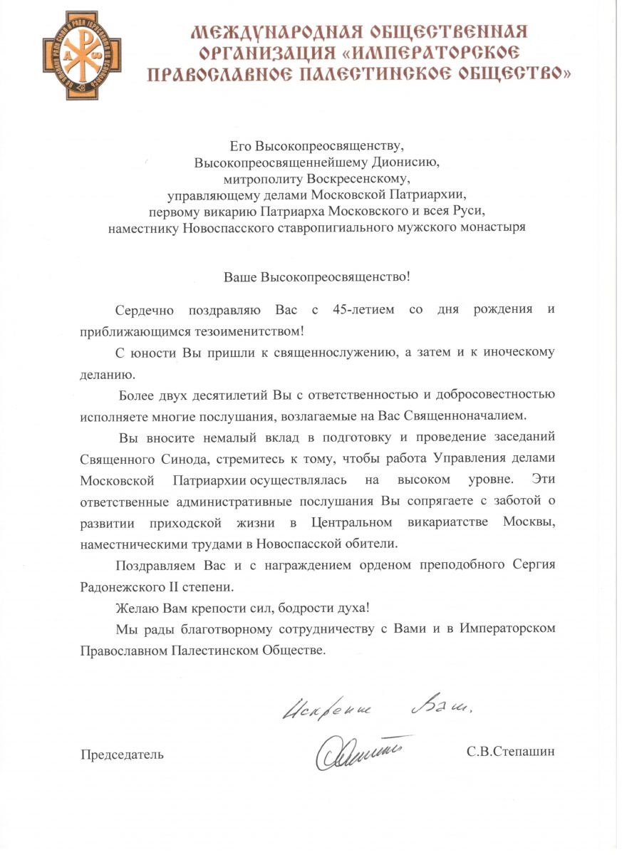 1 октября 2020 года Председатель ИППО Сергей Степашин поздравил с днём рождения действительного члена Общества, первого викария Святейшего Патриарха Московского и всея Руси Кирилла, наместника Новоспасского ставропигиального мужского монастыря митрополита Воскресенского Дионисия.