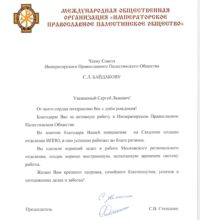 Поздравление в адрес Сергея Львовича направил Председатель Императорского Православного Палестинского Общества Сергей Степашин.