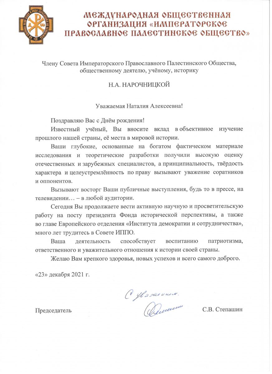 Председатель ИППО Сергей Степашин поздравил Наталию Алексеевну с днём рождения, поблагодарив за большой вклад в деятельность Императорского Православного Палестинского Общества.