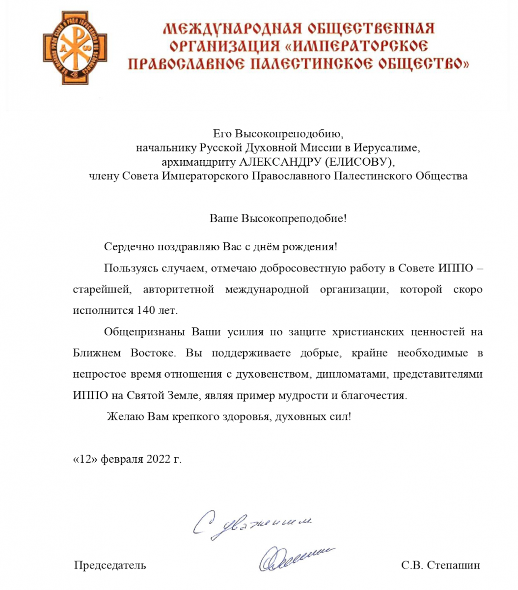 12 февраля день рождения отмечает член Совета ИППО, начальник Русской Духовной Миссии в Иерусалиме архимандрит Александр (Елисов).
