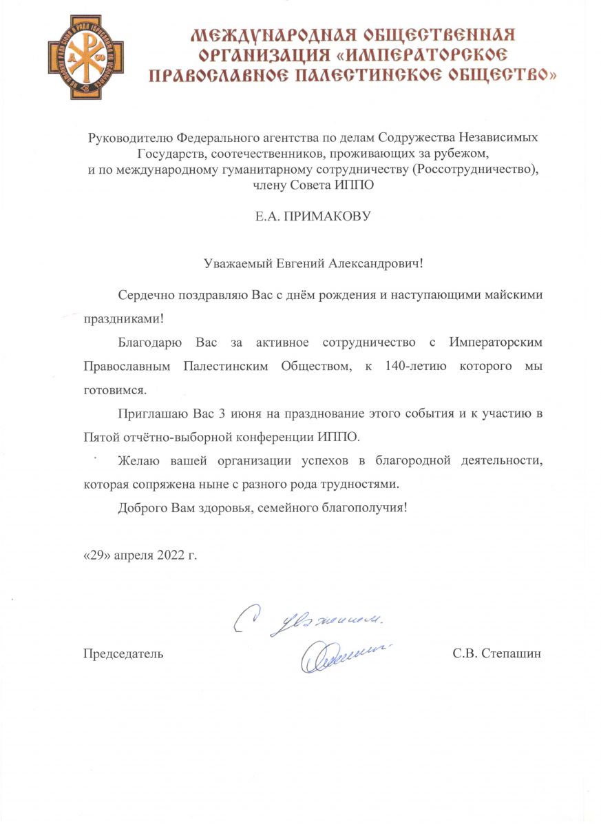 Председатель ИППО Сергей Степашин поздравил Евгения Александровича с днём рождения.