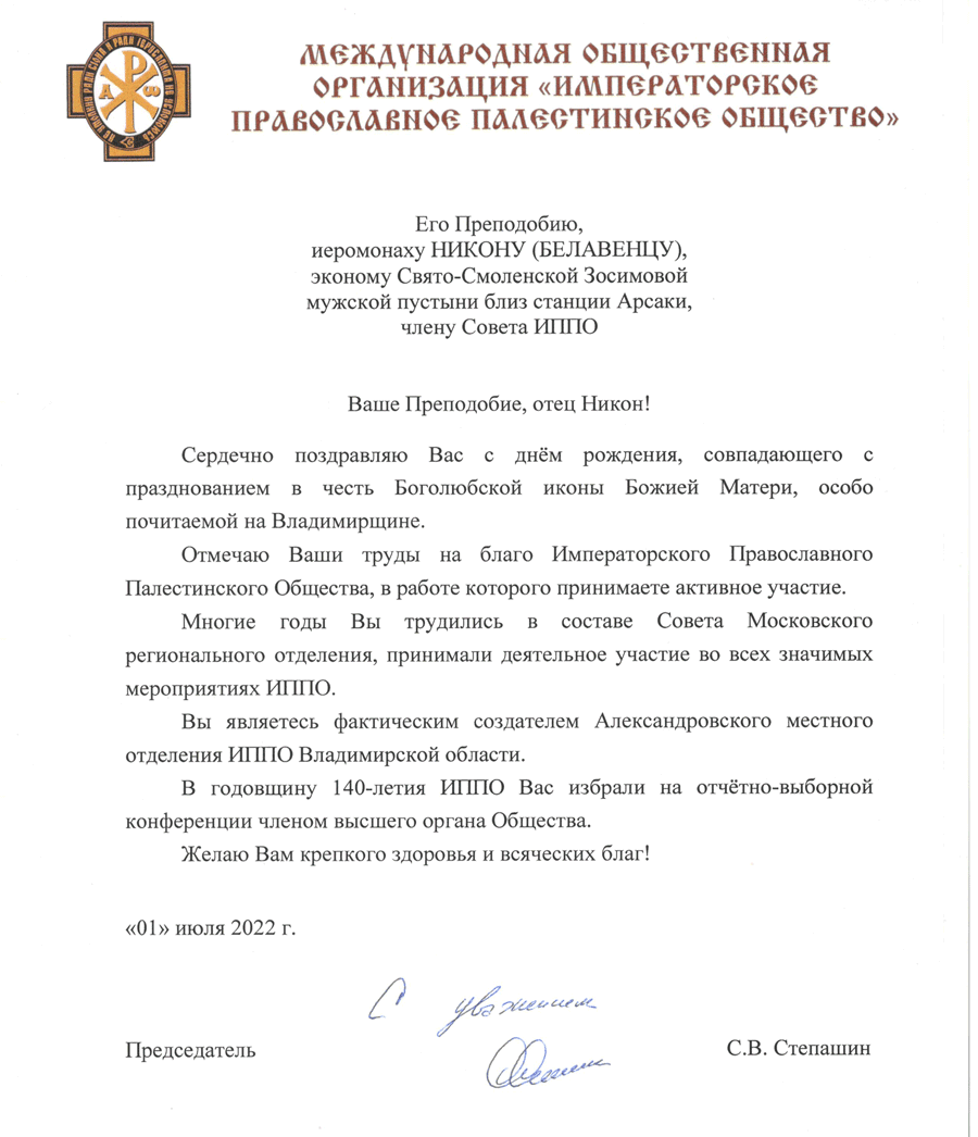 Поздравление в адрес иеромонаха Никона направил Председатель Общества Сергей Степашин.