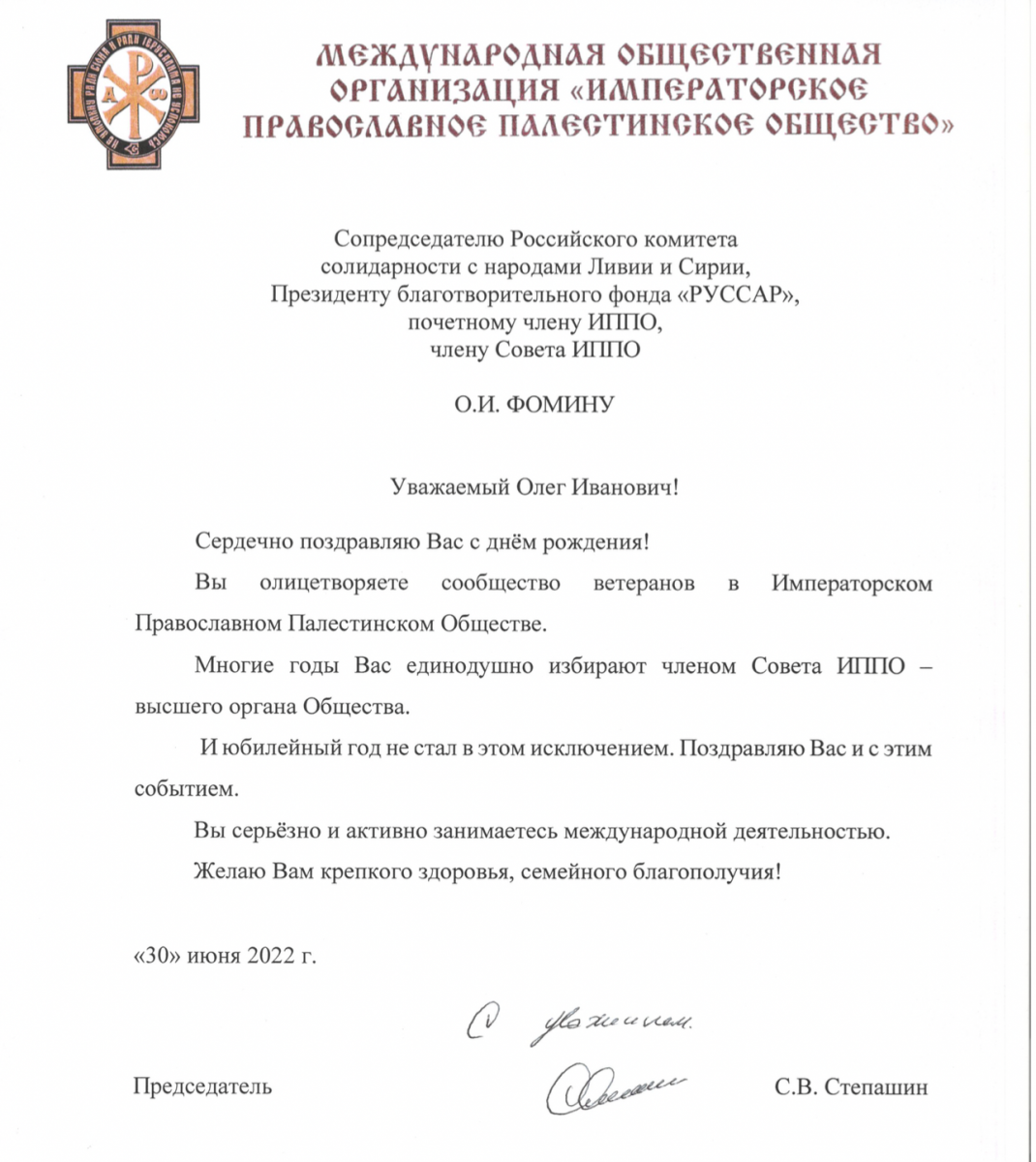 Поздравление в адрес Олега Ивановича направил Председатель Императорского Православного Палестинского Общества Сергей Степашин.