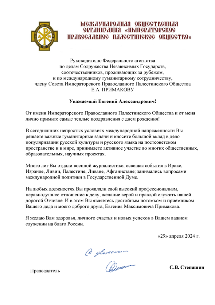 29 апреля день рождения отмечает член Совета ИППО, руководитель Федерального агентства по делам Содружества Независимых Государств, соотечественников, проживающих за рубежом, и по международному гуманитарному сотрудничеству (Россотрудничество) Евгений Примаков.