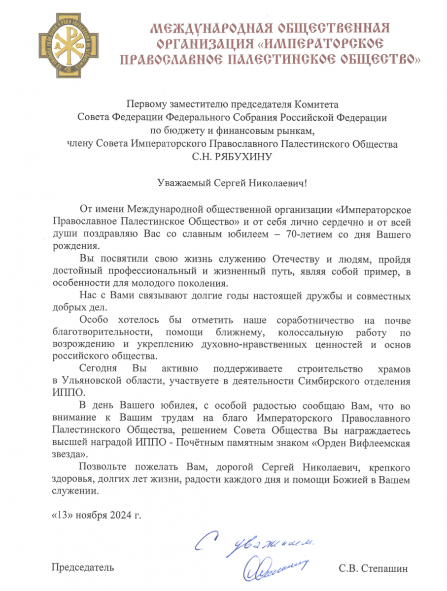 Председатель ИППО Сергей Степашин направил поздравление Сергею Николаевичу, в котором говорится: