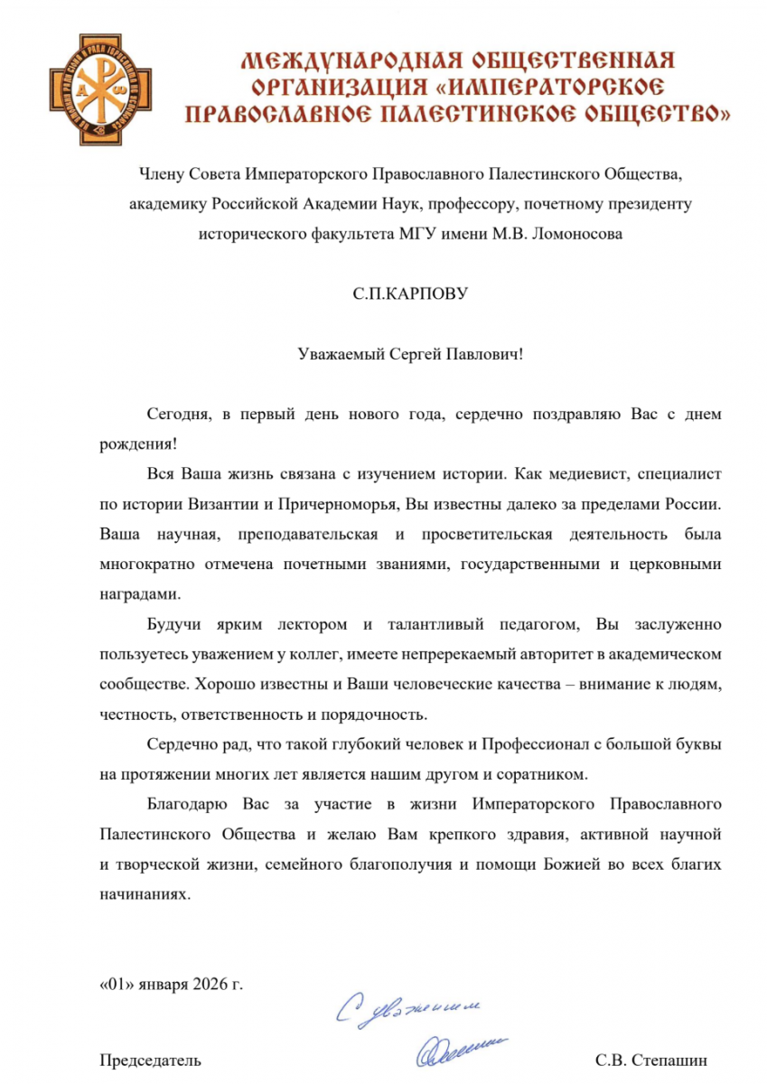 1 января день рождения отмечает известный российский историк, действительный член (академик) Российской академии наук, действительный член Российской академии естественных наук, президент исторического факультета Московского государственного университета им. М. В. Ломоносова, член Совета и Почётный член Императорского Православного Палестинского Общества Сергей Карпов.
