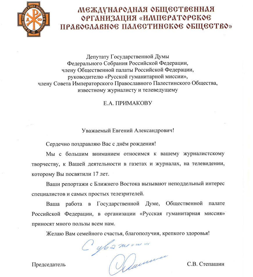 Сегодня день рождения у российского журналиста, теле- и радиоведущего, историка, члена Общественной палаты Российской Федерации, председателя Наблюдательного совета Автономной некоммерческой организации «Русская гуманитарная миссия», депутата Государственной Думы, советника председателя Государственной Думы Евгения Примакова. Сергей Степашин поздравил Евгения Александровича с днём рождения.