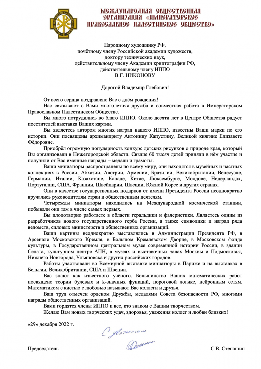 Поздравление в адрес Владимира Глебович направил Председатель Императорского Православного Палестинского Общества Сергей Степашин.
