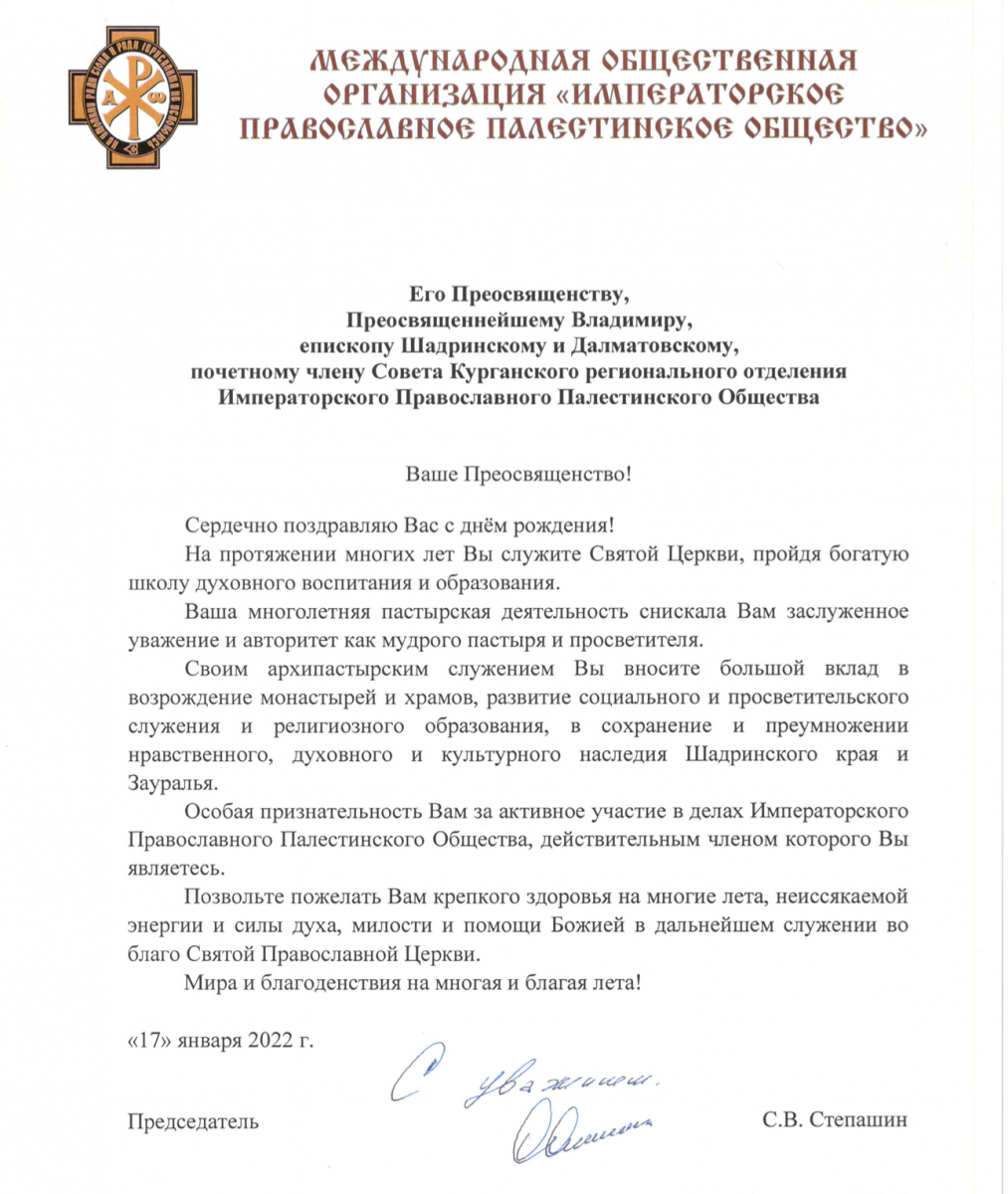 Поздравление в адрес Главы Шадринской епархии направил Председатель Общества Сергей Степашин: