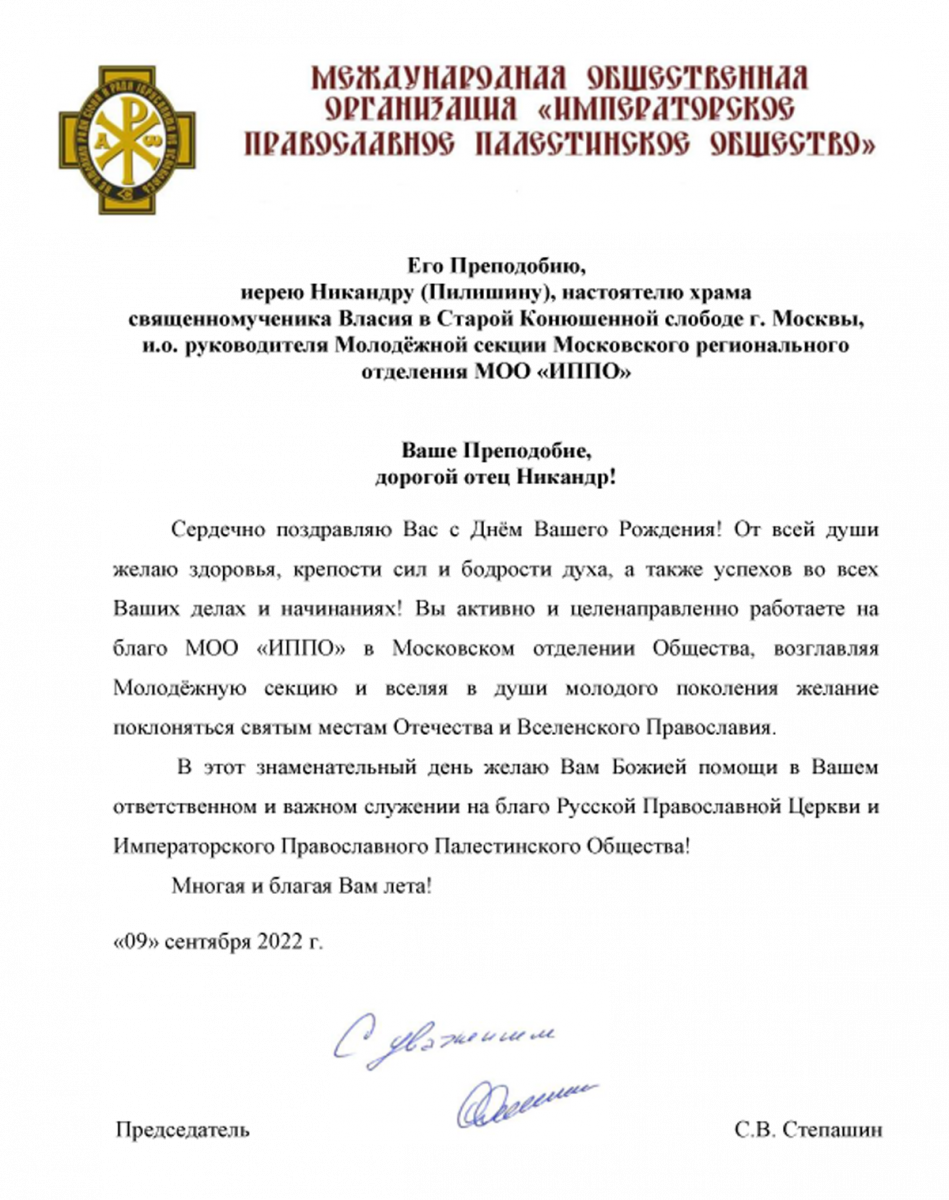 Поздравление в адрес отца Никандра направил Председатель ИППО Сергей Степашин: