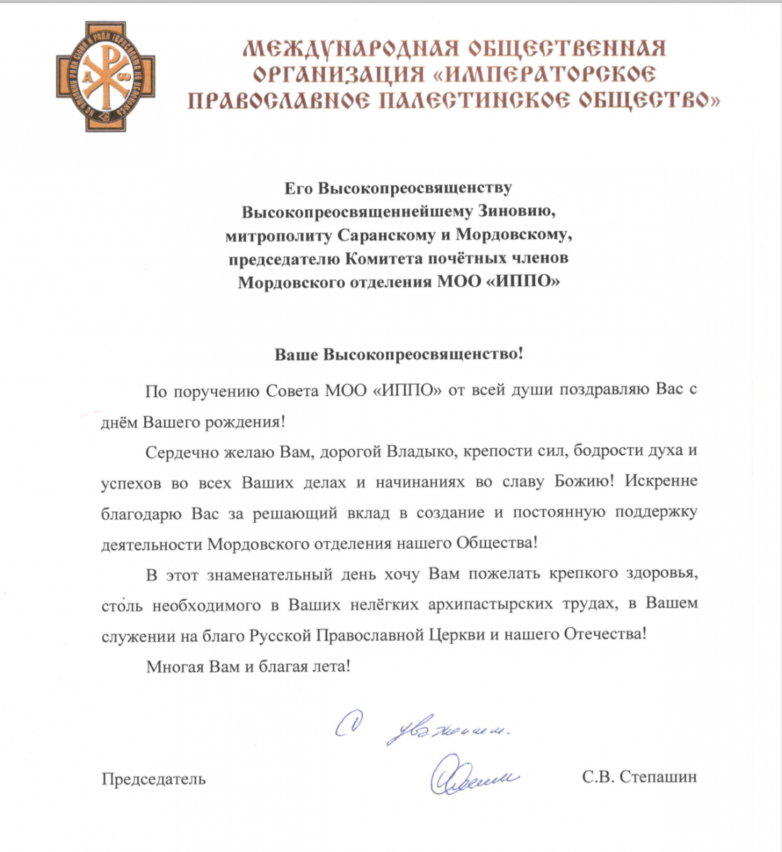 Председатель ИППО Сергей Степашин поздравил с днём рождения владыку Зиновия.