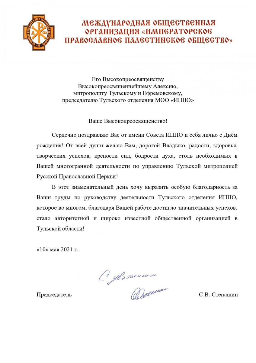 Поздравление в адрес владыки направил Председатель Императорского Православного Палестинского Общества Сергей Степашин.