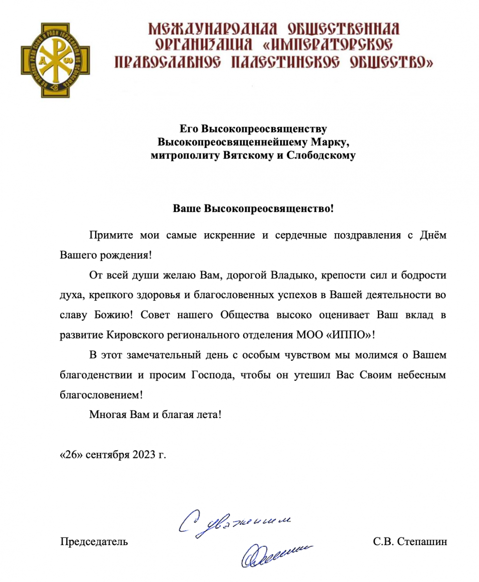 Поздравление по случаю дня рождения в адрес владыки Марка направил Председатель ИППО Сергей Степашин.