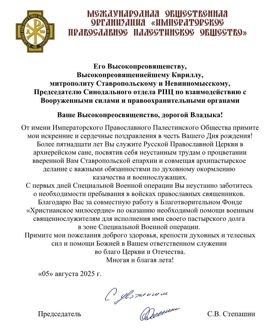 5 августа день рождения отмечает председатель Синодального отдела по взаимодействию с Вооруженными силами и правоохранительными органами, председатель Синодального комитета по взаимодействию с казачеством, председатель Попечительского совета Ставропольского отделения ИППО митрополит Ставропольский и Невинномысский Кирилл.