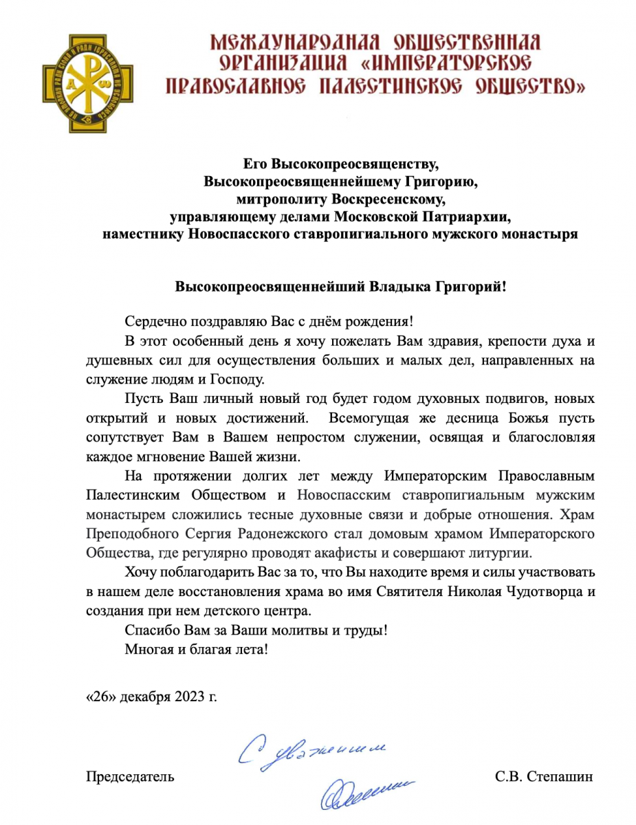 Поздравление в адрес владыки Григория направил Председатель ИППО Сергей Степашин: