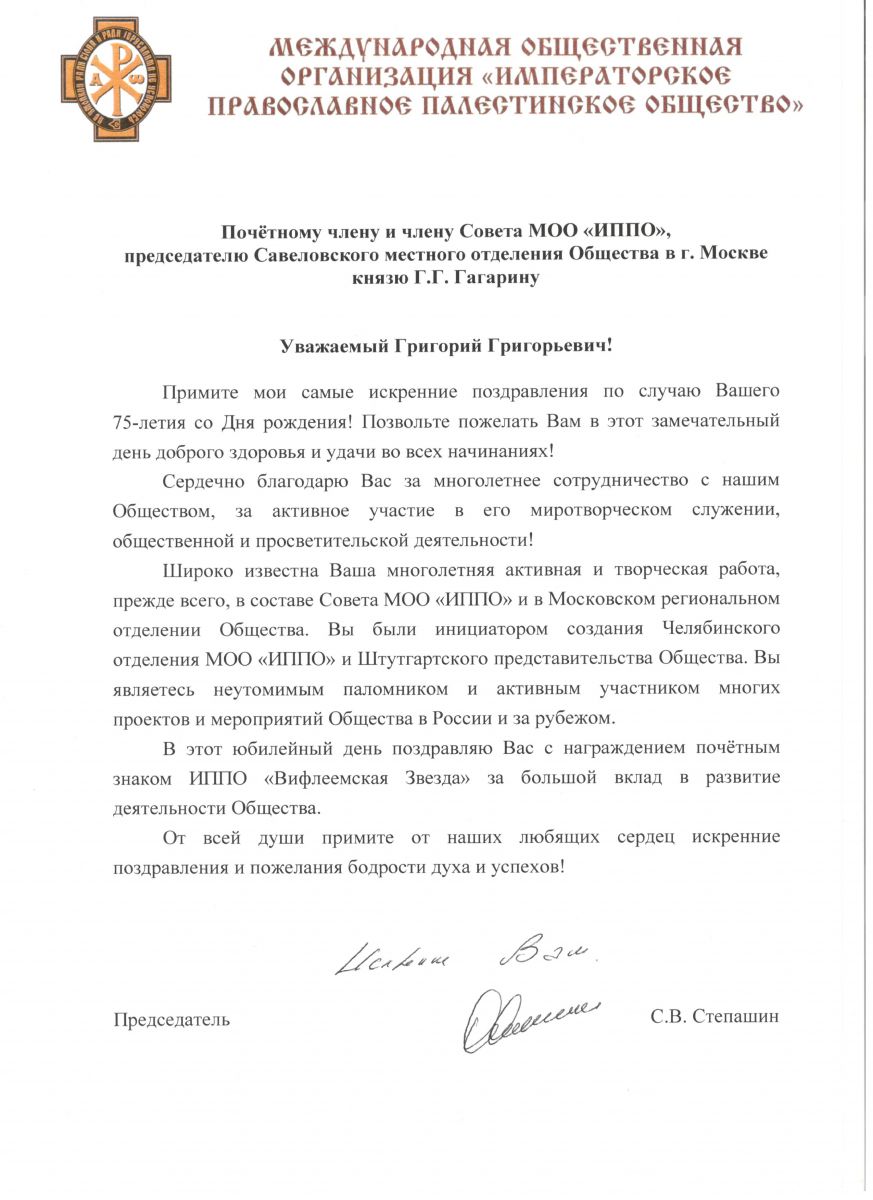 2 октября Председатель ИППО Сергей Степашин поздравил с днём рождения Почётного члена ИППО, руководителя Савёловского отделения Общества в Москве князя Григория Гагарина.