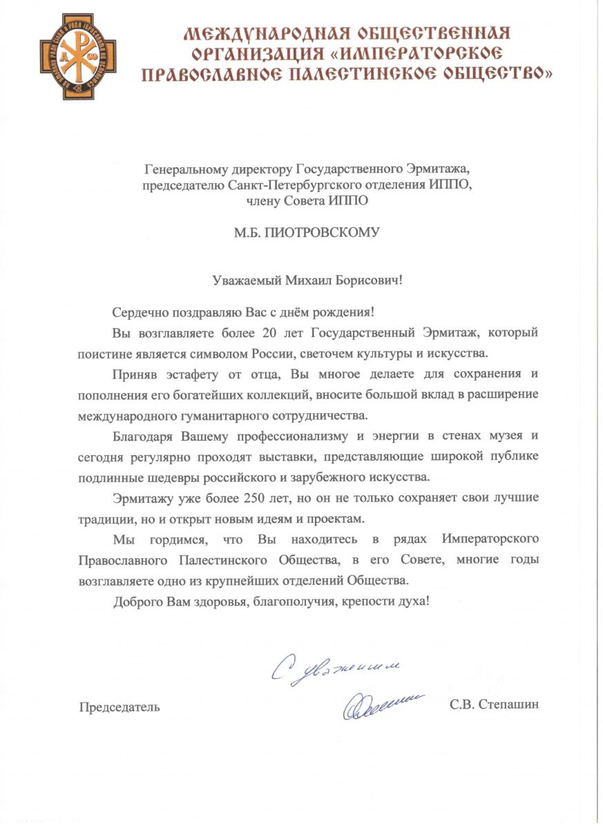 Председатель ИППО Сергей Степашин тепло поздравил Михаила Борисовича, поблагодарив за активную работу в Императорском Православном Палестинском Обществе, за содействие в реализации научных и культурно-просветительских проектов.