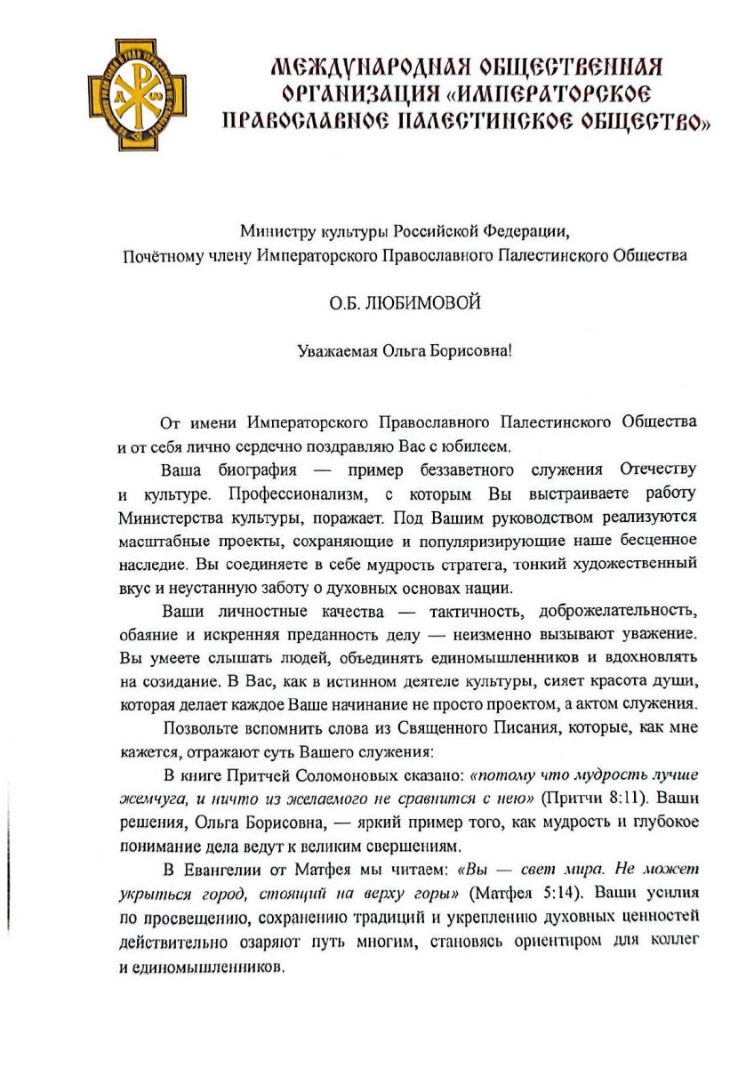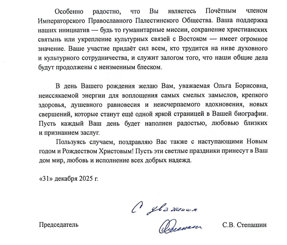 Поздравление в адрес Ольги Борисовны направил экс-премьер России, Председатель Императорского Православного Палестинского Общества Сергей Вадимович Степашин: