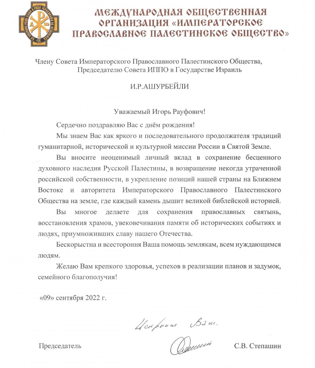 Игорь Ашурбейли вносит неоценимый личный вклад в сохранение бесценного духовного наследия Русской Палестины, в возвращение некогда утраченной российской собственности, в укрепление позиций нашей страны на Ближнем Востоке и авторитета Императорского Православного Общества на земле, где каждый камень дышит великой библейской историей.